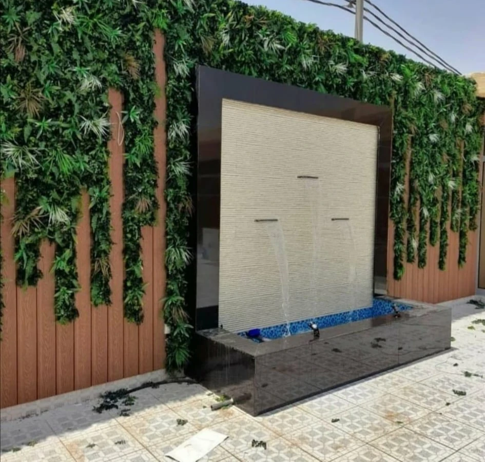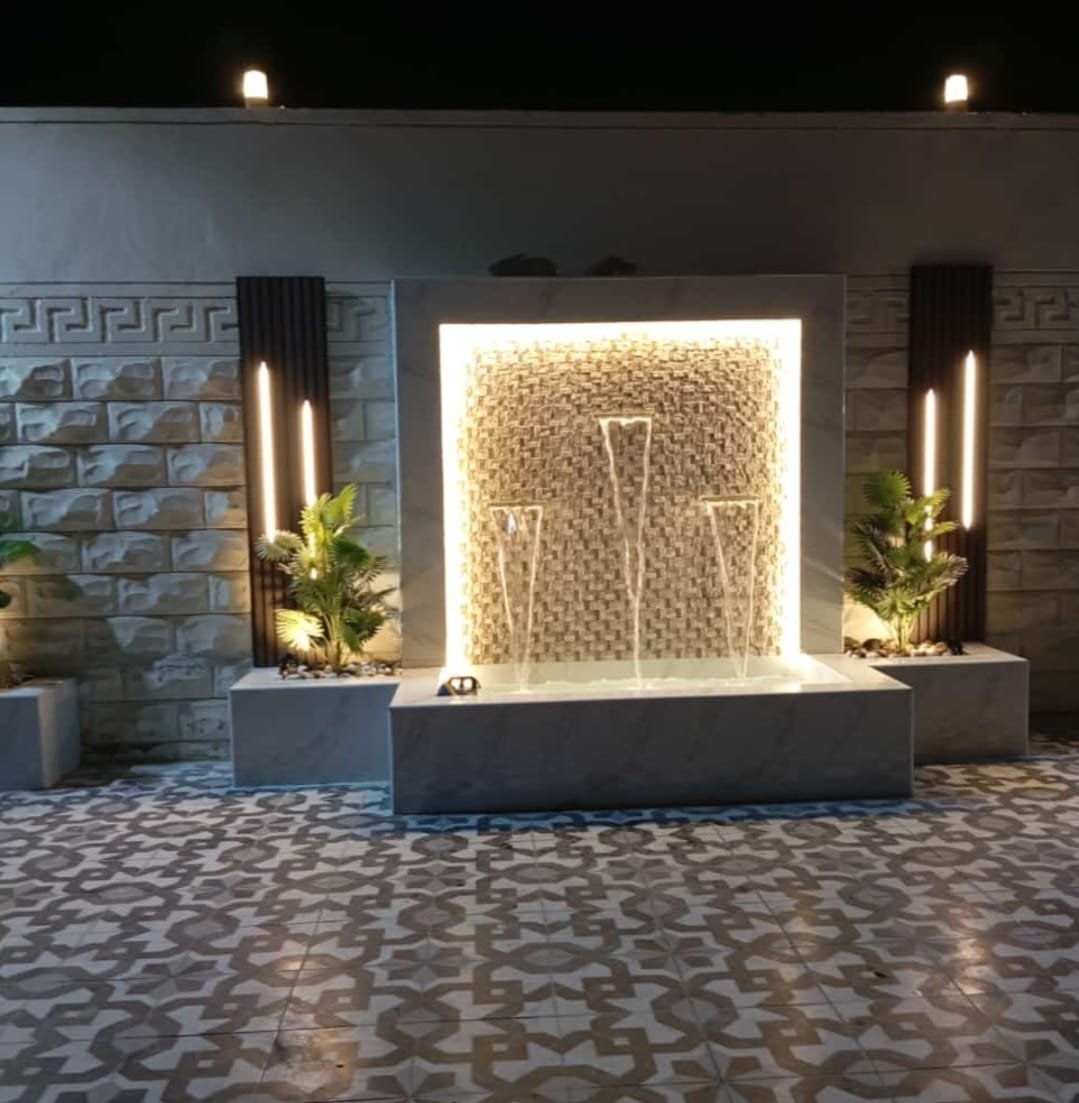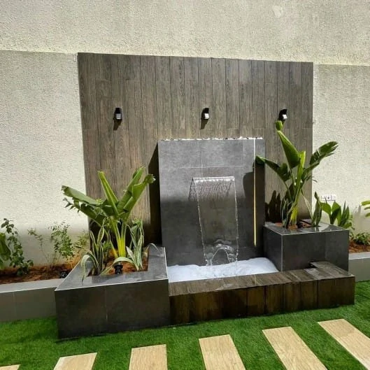 - الشلالات الجدارية فائقة النحافة: هي الأكثر طلباً في الفلل العصرية. يتم دمجها مباشرة في جدار الحديقة أو السور، غالباً ما تكون مصنوعة من مواد مثل الرخام المصقول، أو الستانلس ستيل، أو الحجر الطبيعي الأسود، لتعطي انسياباً مائياً هادئاً كأنبوب زجاجي.