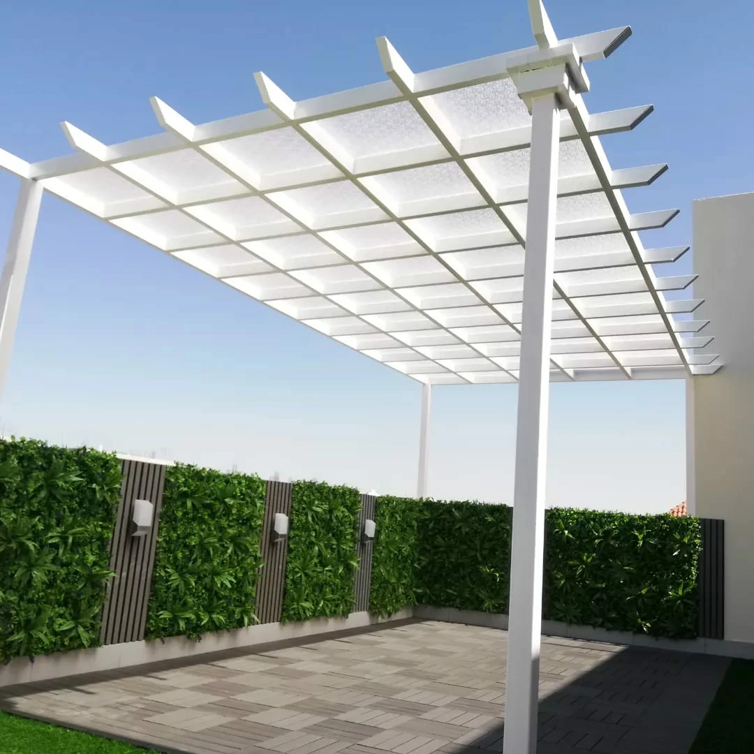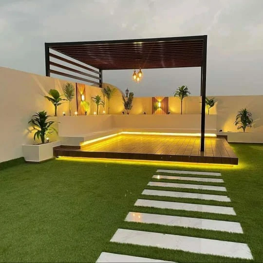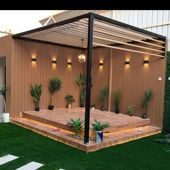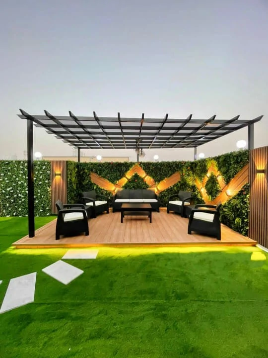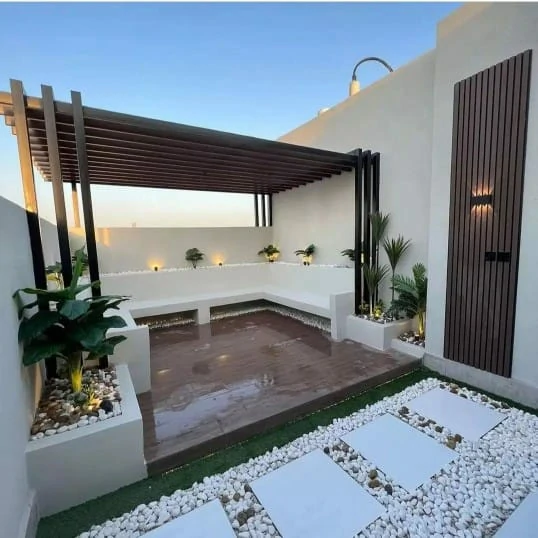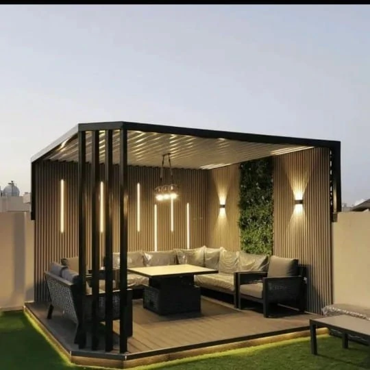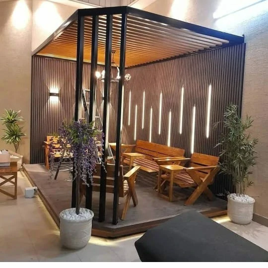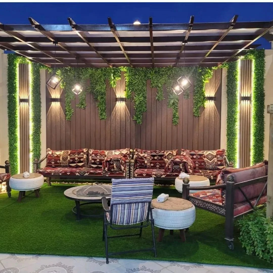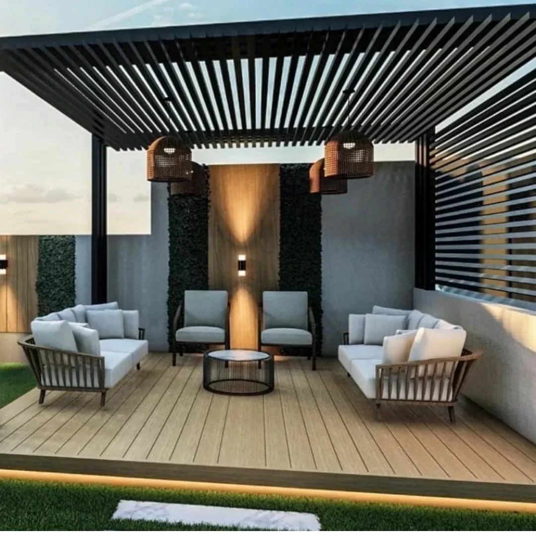 - الجلسات الشتوية المغلقة جزئياً: لم يعد استخدام الفناء محصوراً بالصيف. المظلات الحديثة ذات الشرائح المتحركة تتيح التحكم في الظل والتهوية، مع دمج أنظمة تدفئة خارجية خفية لضمان استخدام الجلسة على مدار العام.
