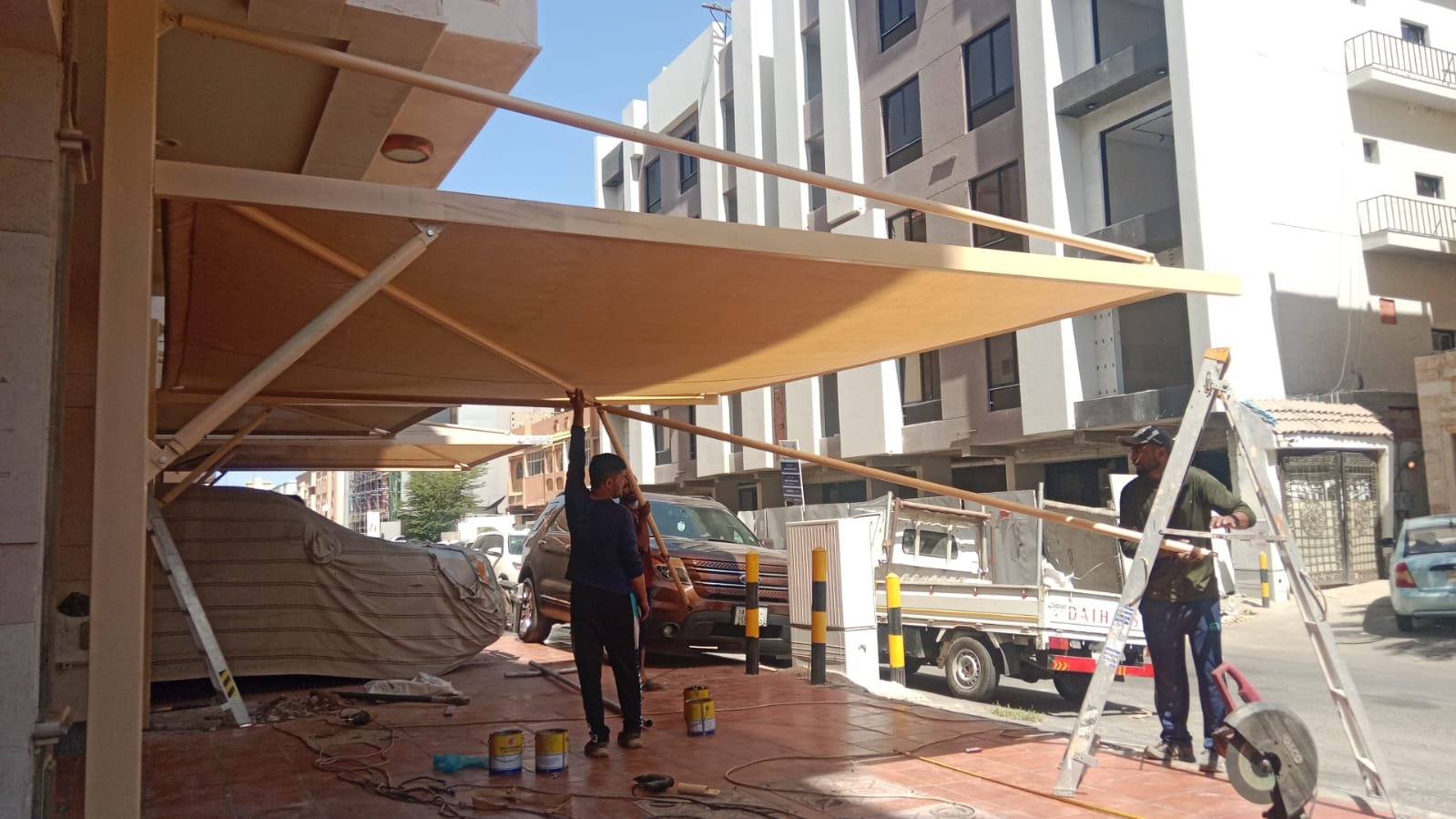 - الخامات المستخدمة: يجب أن يستخدم المحل خامات عالية الجودة ومقاومة للحرارة والصدأ (مثل قماش الـ PVC الألماني والكوري، الهياكل الحديدية المعالجة، والأخشاب المعالجة).