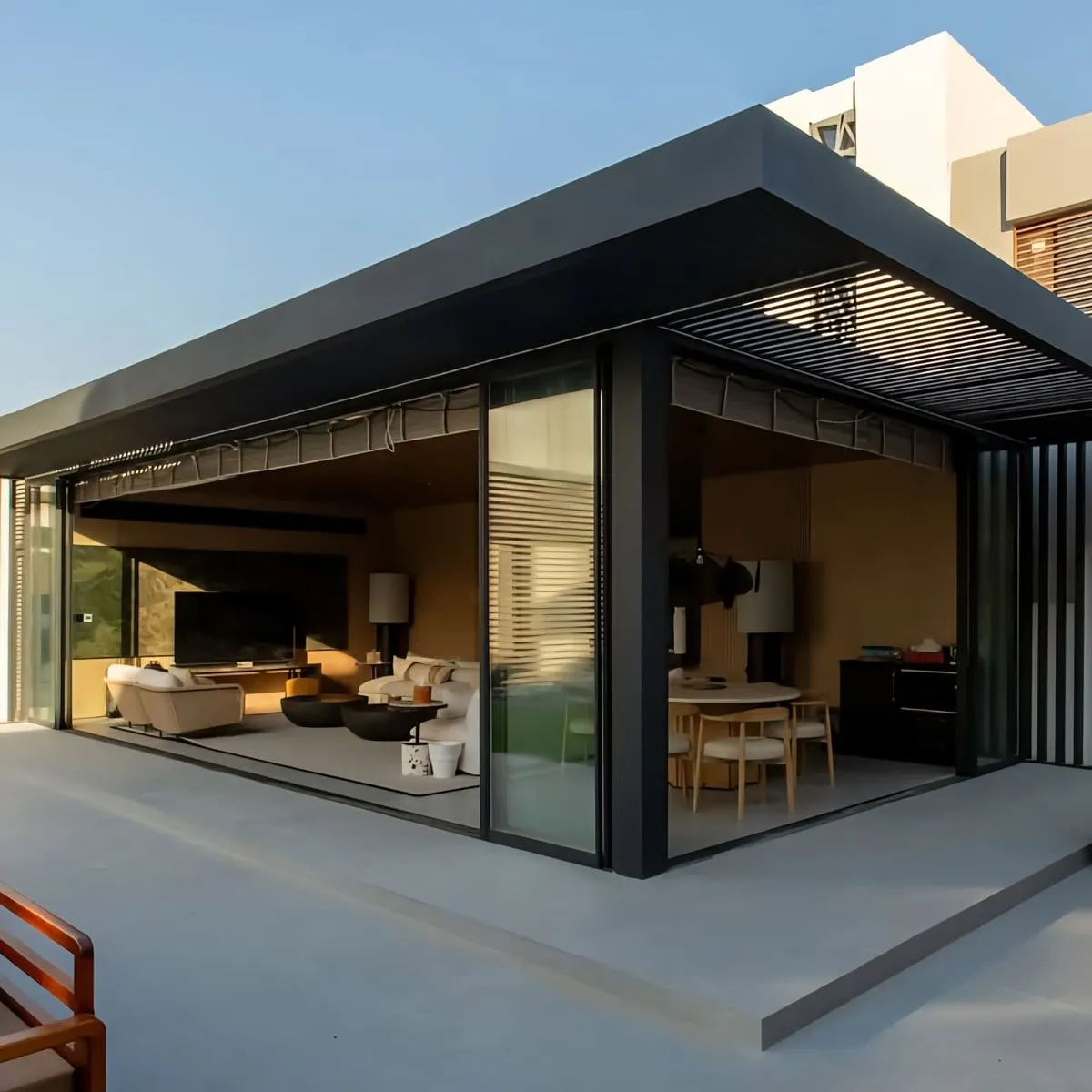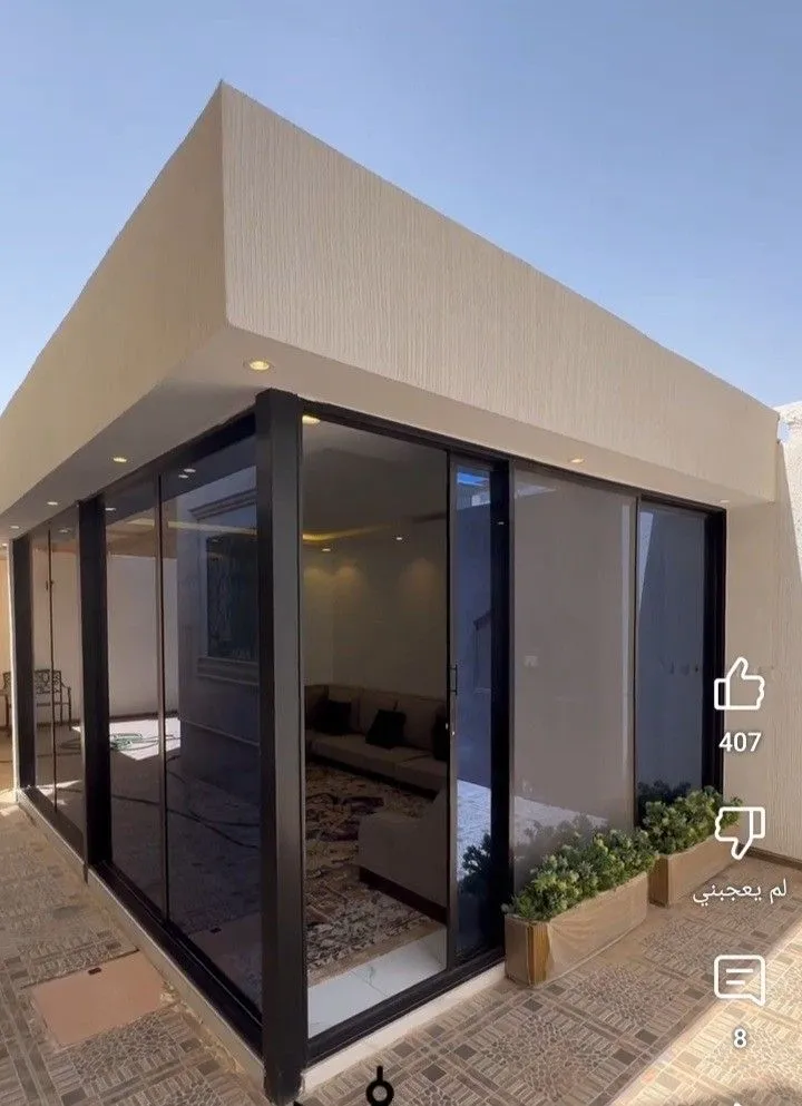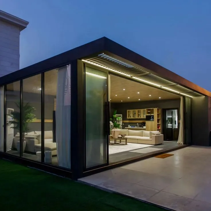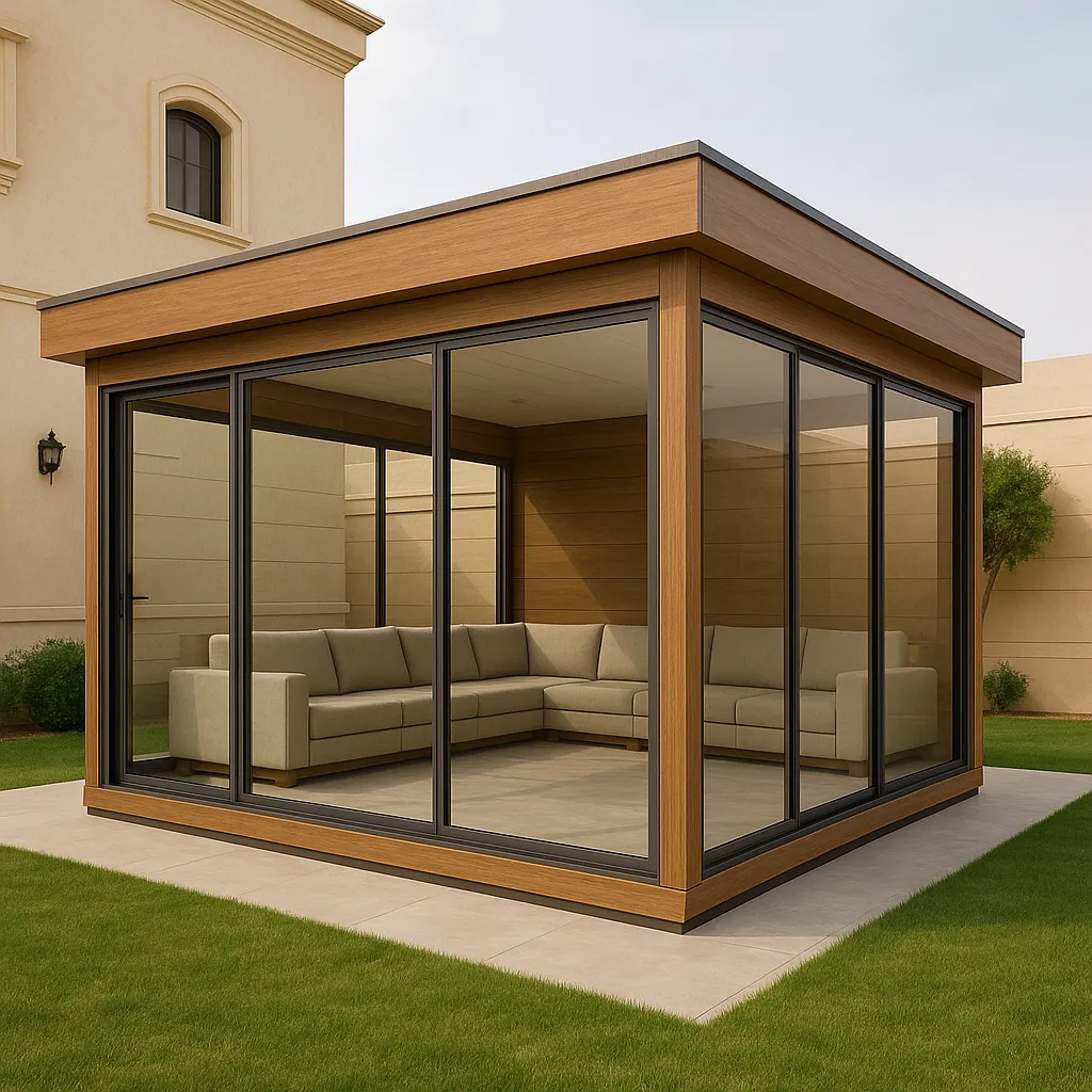 - المجالس المودرن: يتم دمج ألواح الساندوتش بنل مع واجهات زجاجية (استركشر) لإعطاء إطلالة بانورامية على الحديقة.