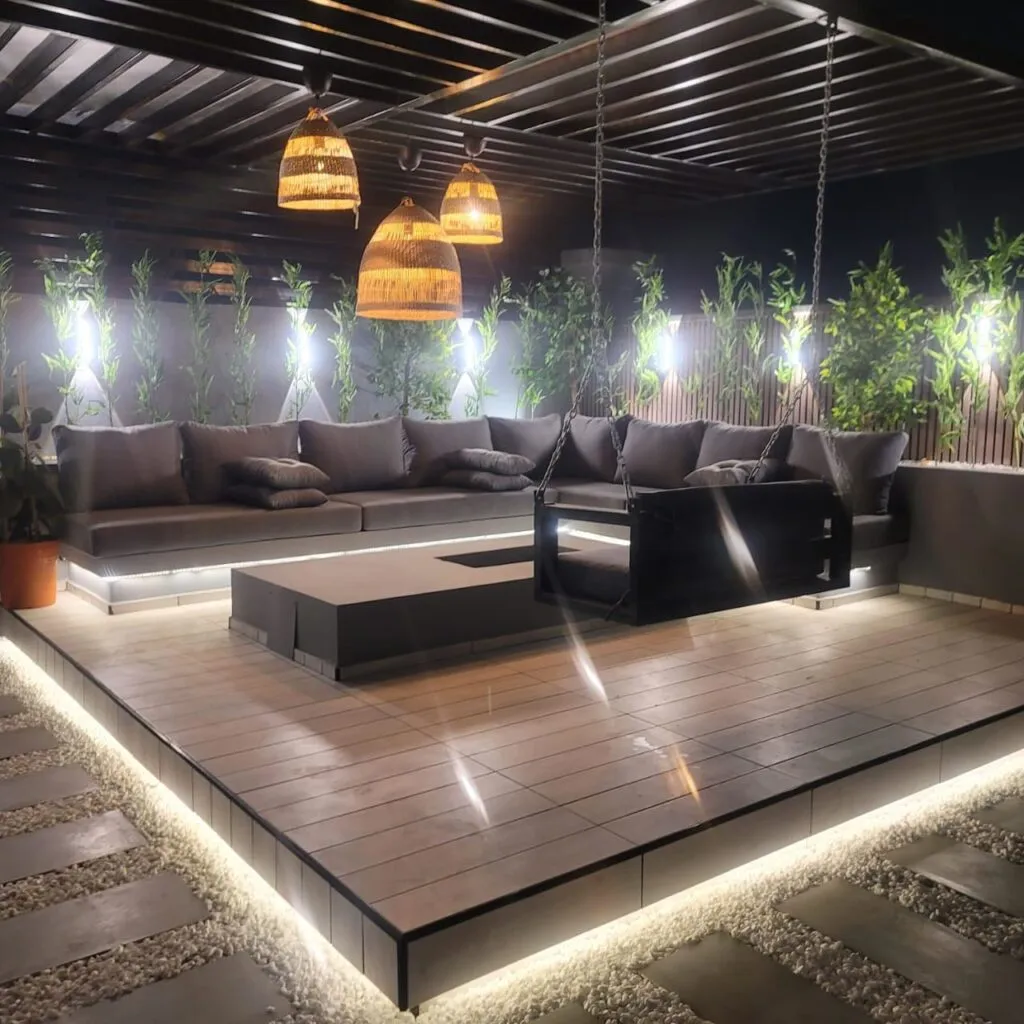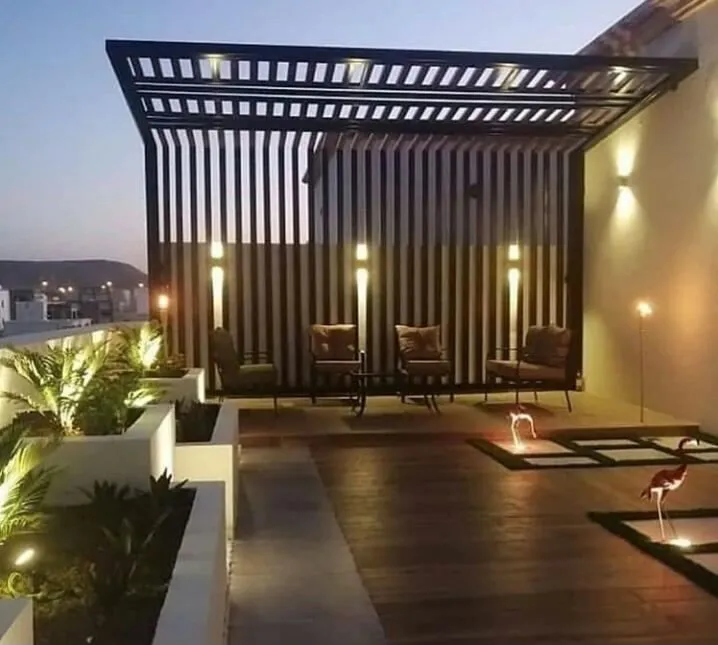 - الإضاءة المدمجة: إضافة أشرطة LED أو فوانيس جدارية داخل البرجولة لخلق أجواء ليلية ساحرة.