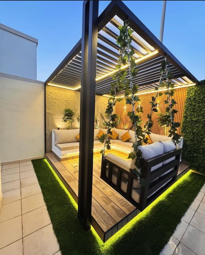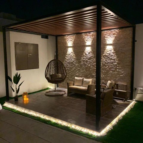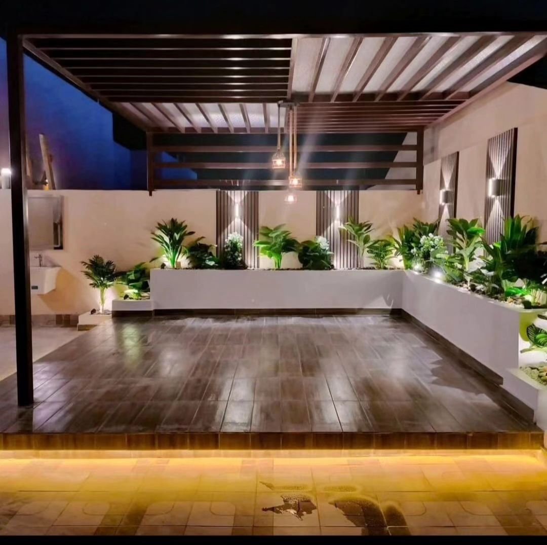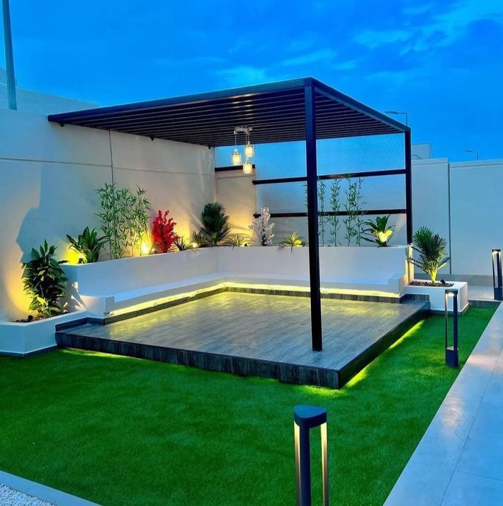 - المظلات الخشبية (البرجولات): تعطي لمسة كلاسيكية فخمة، ويُفضل استخدام الخشب المعالج أو “الليوود” لمقاومة النمل الأبيض والتآكل.